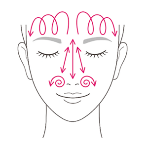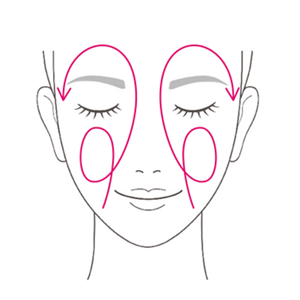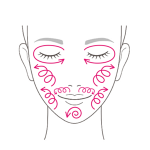 ほお、 口もと、 目もとはくるくると円を描きやさしくなじませます。水またはぬるま湯でよく洗い流します。